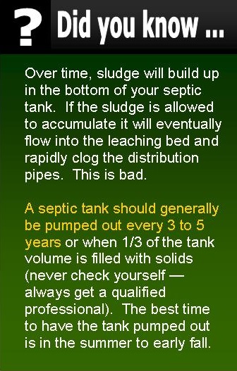 As you know, each time you turn on a faucet, take a shower, flush a toilet, or do a load of laundry, the water and waste travels out of the house and into the Septic Tank. Some of the waste sinks to the bottom and some of it floats. As more water goes into the Septic Tank, an equal amount of fluids gets pushed out to the Leachfield/Drainfield. The plumbing vent allows the gases that are produced in the septic to escape, so that the smell does enter the house.
