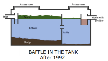 As the waste drops down into the first chamber, the fluids naturally separate based on their weight. Therefore, the sludge, mainly human waste and toilet paper, go to the bottom because they are the heaviest. Then, the water on top of that, and then scum, mostly hand lotions, soaps, shampoos etc., float on top of the water. We want as much sludge and scum to stay in this chamber as possible. However, we all know the 'ideal' world is not the world we live in, and that is why we have a second chamber!