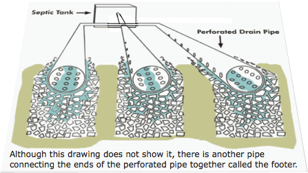 Since the early 1970s perforated pipe and rock became the materials most used for Drainfields. The wastewater passes through the tank into a distribution pipe called the header. Then travels through the perforated pipes that are called laterals. There is another pipe connecting the ends of the perforated pipe together called the footer. This completes the Drainfield in a closed loop system.